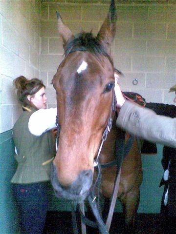 CORNAS (Cheval Mascot) ALERT: VineTrail pay a fair amount of the feed and keep of CORNAS, our Cheval Mascot, so we must report that he ran 8th in a field of 21 over 2 miles at Cheltenham in March. He travelled in the first four for much of the race, but younger legs got away from him on the downhill run towards the stands. His next mission will be in France. He ran at Cheltenham mainly because his trainer, Nick Williams, was busy saddling 4 horses at Cheltenham, and had no stable staff who spoke French available to take him to France. Next time I will ask for volunteers from readers who would enjoy a little sortie avec le Bon Cheval, plus some bistrot grub near Enghien. CORNAS being saddled pre-race at Cheltenham, March 2012, below: ALLEZ CORNAS!!