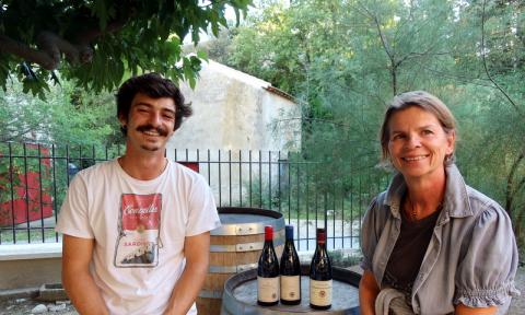 STÉPHANIE FUMOSO WITH SON PAUL AT DOMAINE GOUR DE CHAULÉ, GIGONDAS. STÉPHANIE, WHO TOOK OVER FROM HER MOTHER ALINE, IS A MEMBER OF THE FEMMES VIGNES RHÔNE GROUP